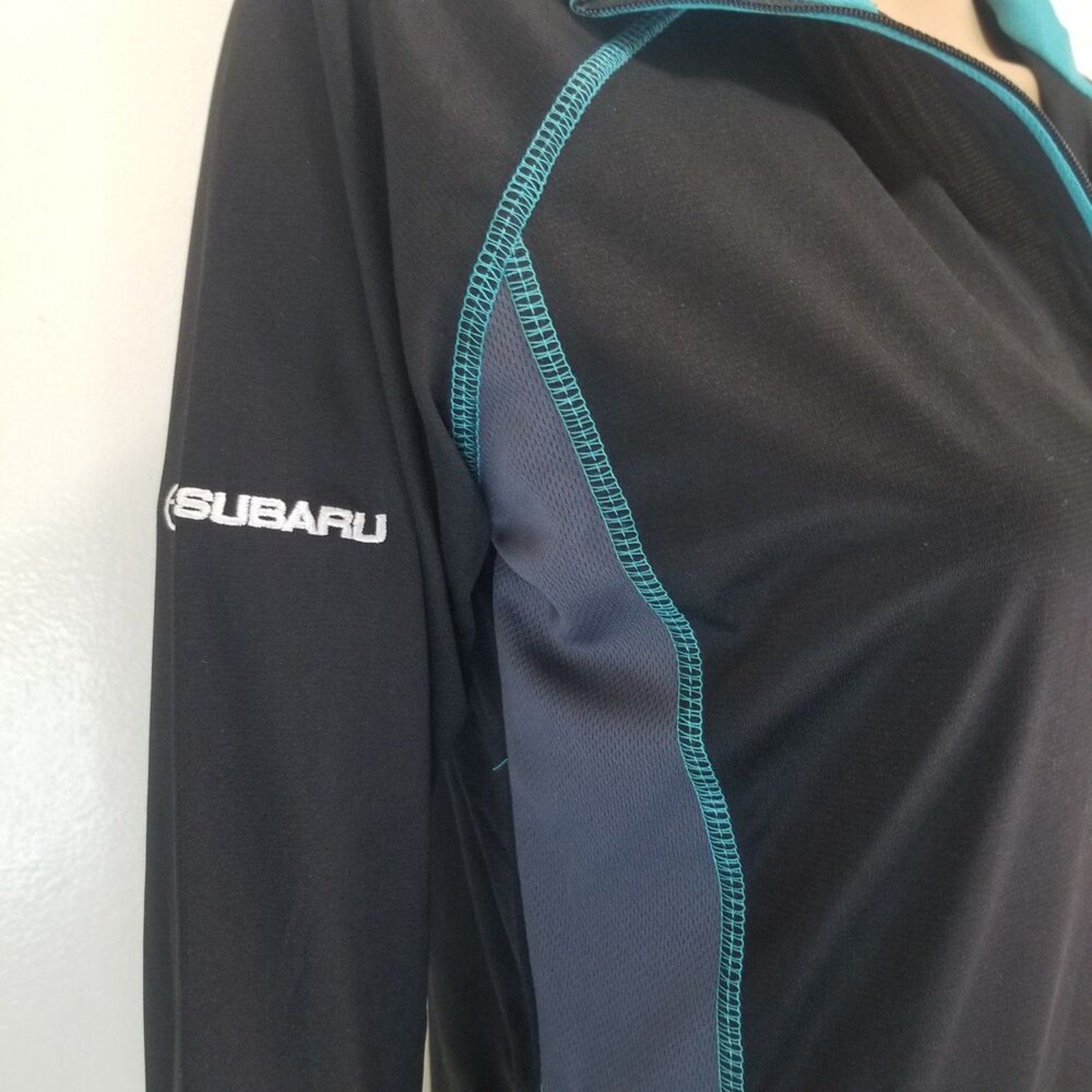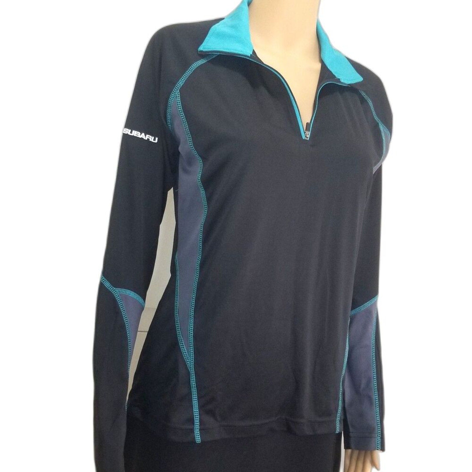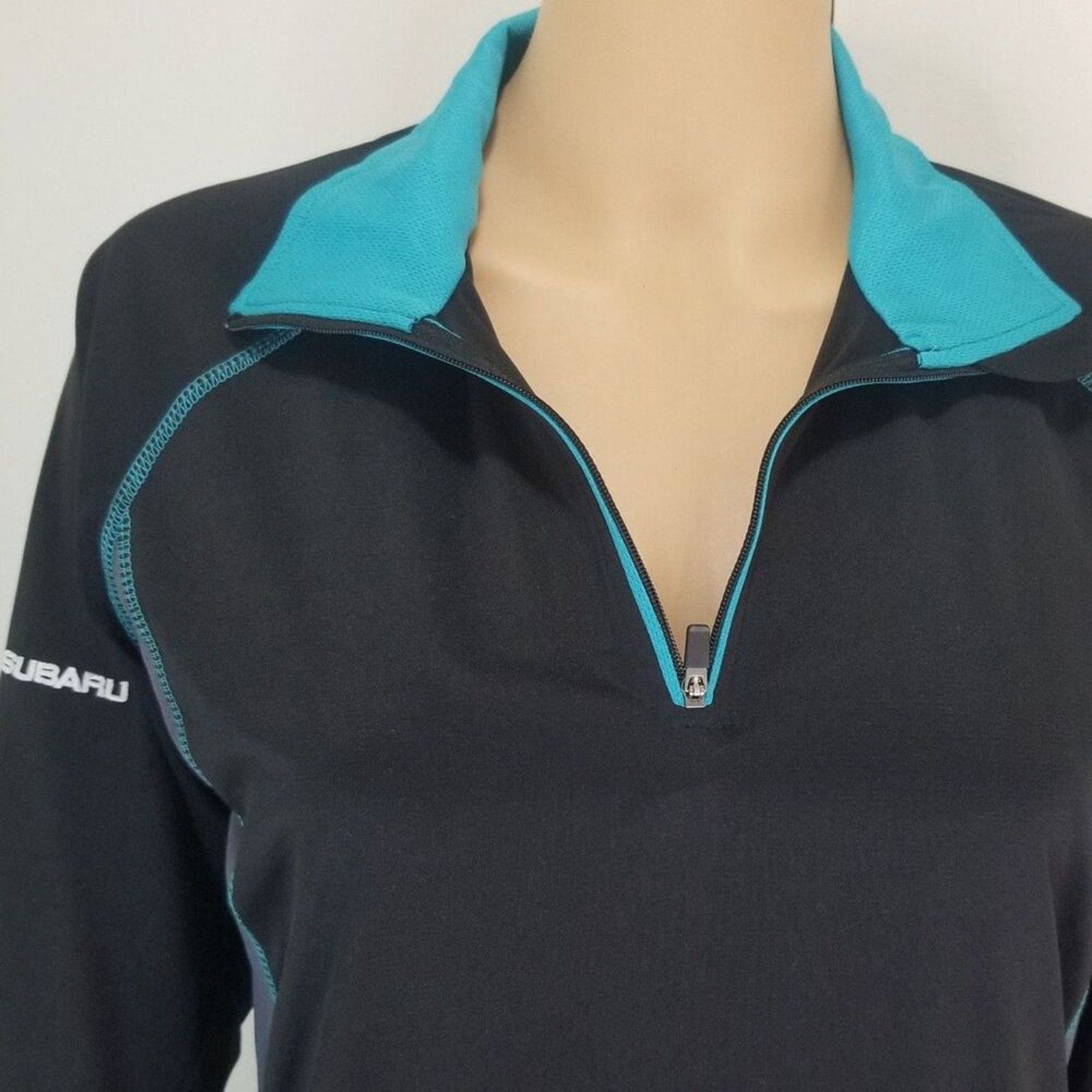 Women's Subaru Black Label pull over long sleeve zip up collar shirt. Aqua blue accents and fold down collar. Subaru embroidered on top of right outside sleeve and over left side of chest.