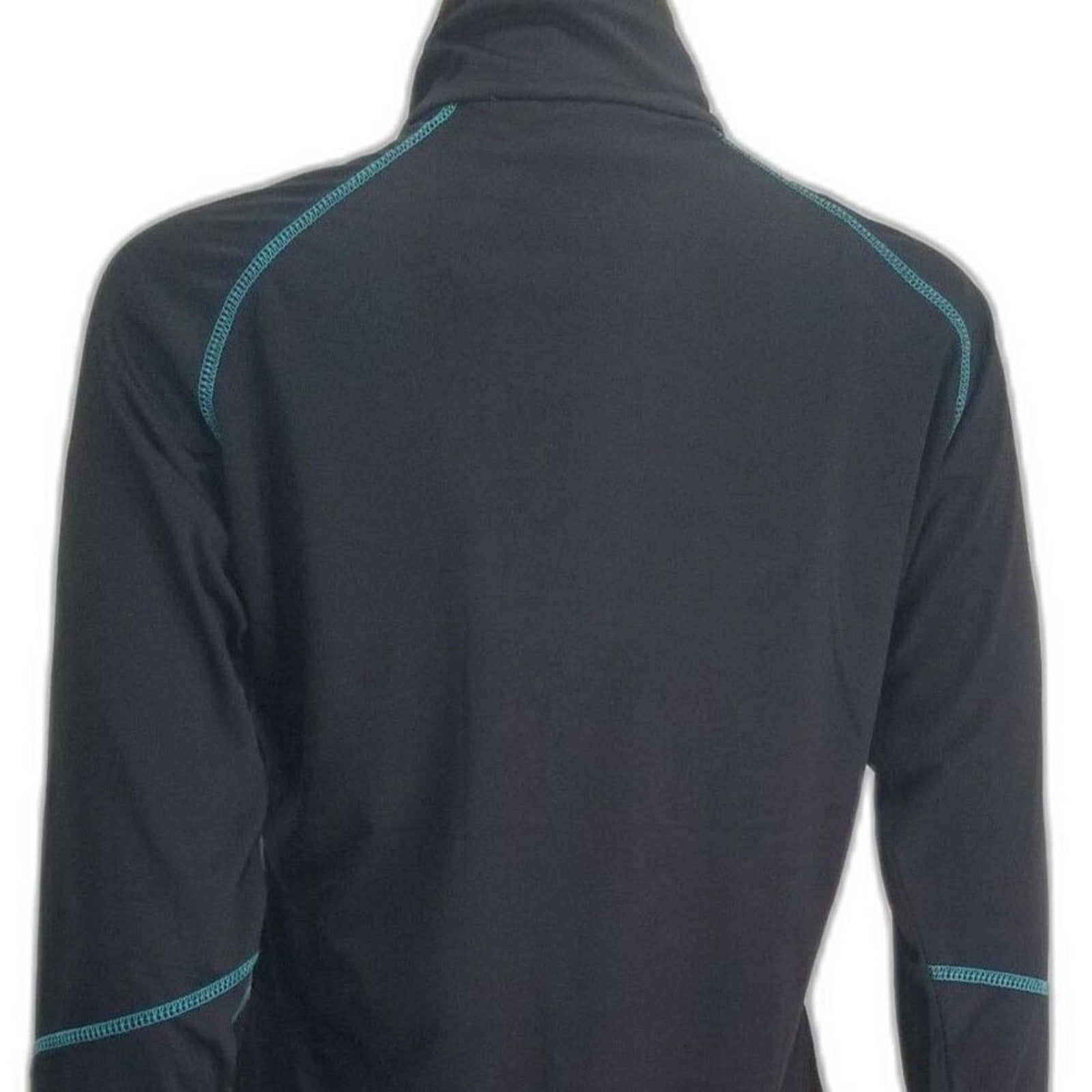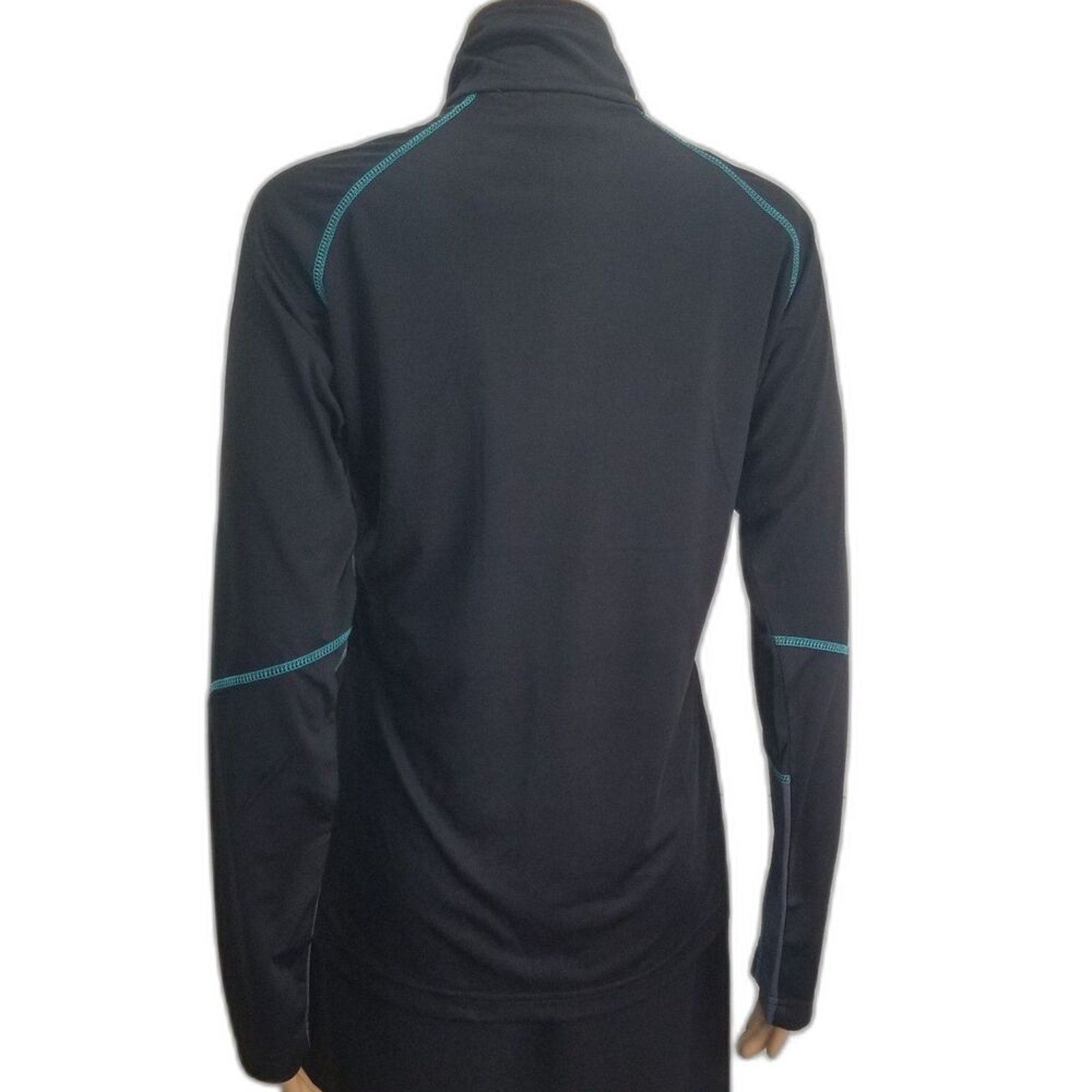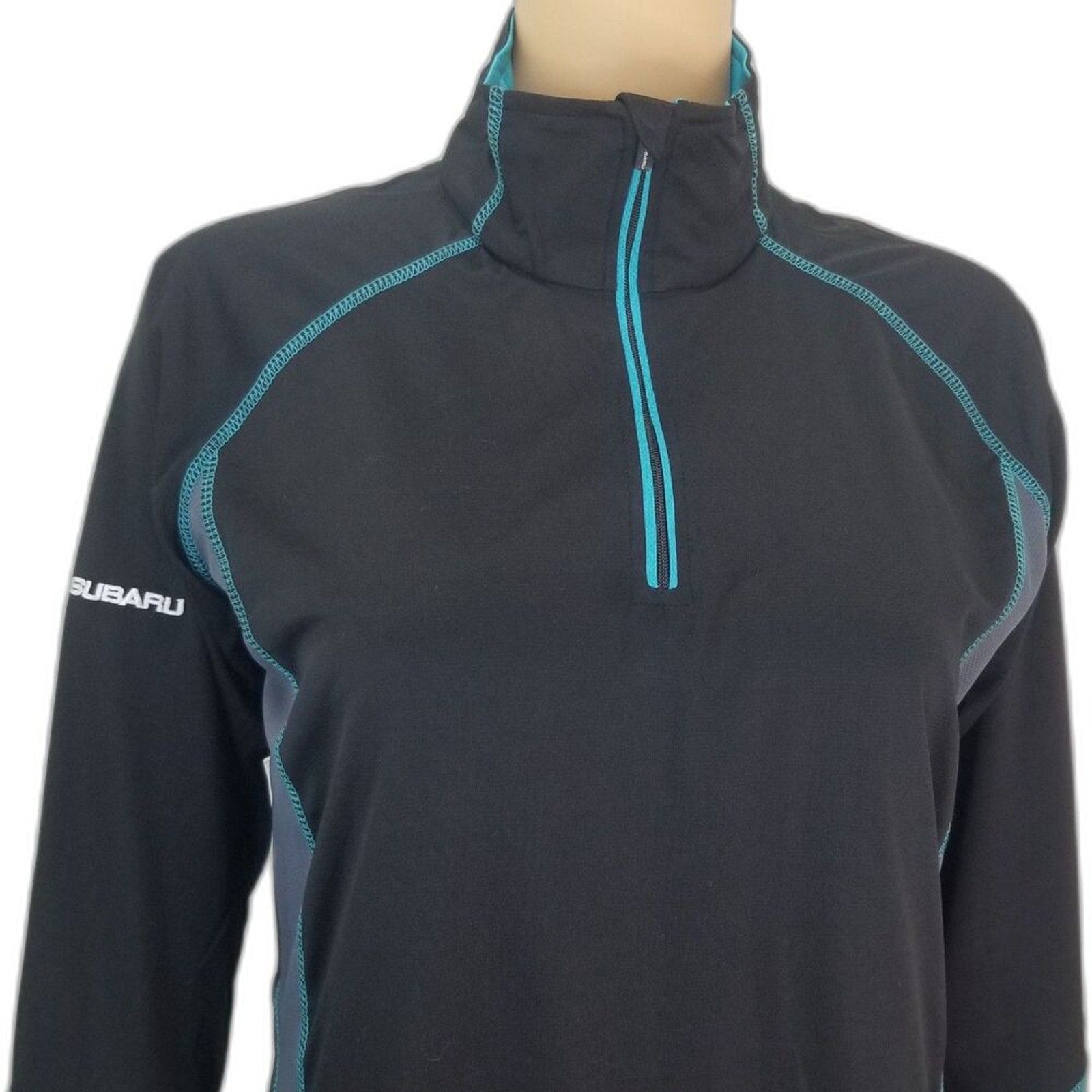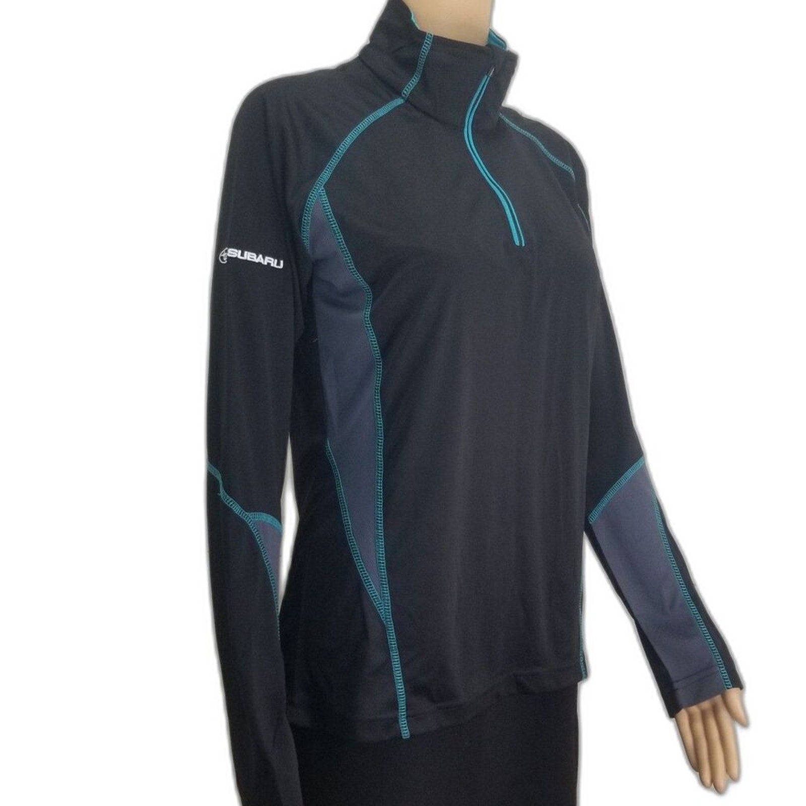 Women's Subaru Black Label pull over long sleeve zip up collar shirt. Aqua blue accents and fold down collar. Subaru embroidered on top of right outside sleeve and over left side of chest.