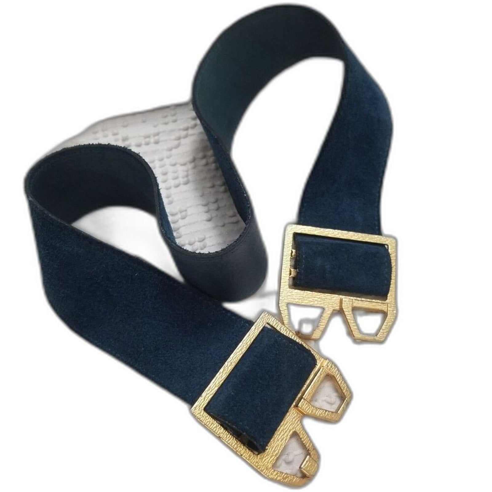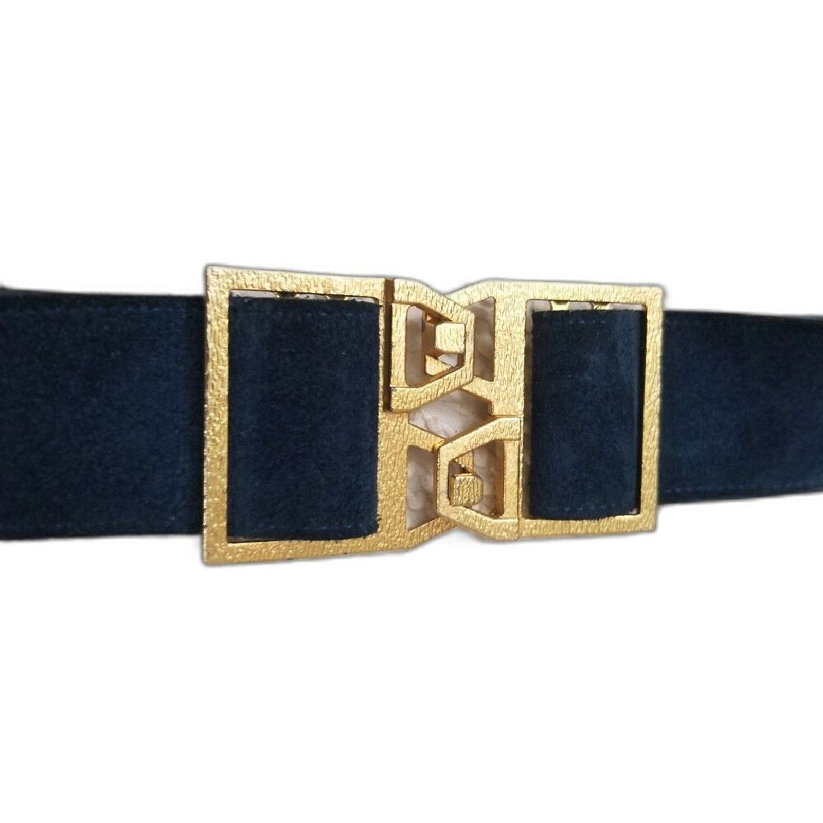 Vintage blue wide suede belt with big gold interlocking cut out buckle. Adjustable slide pulls. One side of buckle closure has a hook and the other side receives the hook from the other buckle closure.