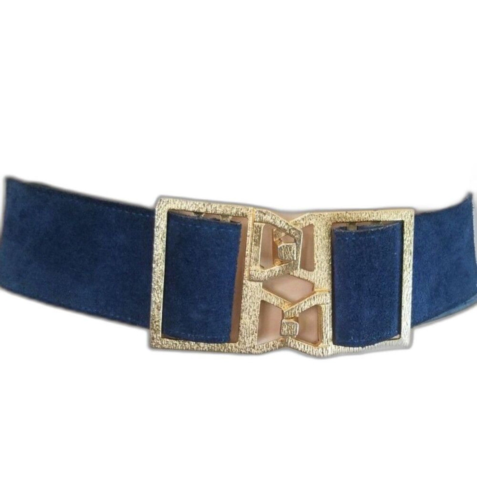 Vintage Big Gold Interlocking Cut Out Buckle Wide Blue Suede Belt Adjustable One Size Fits All