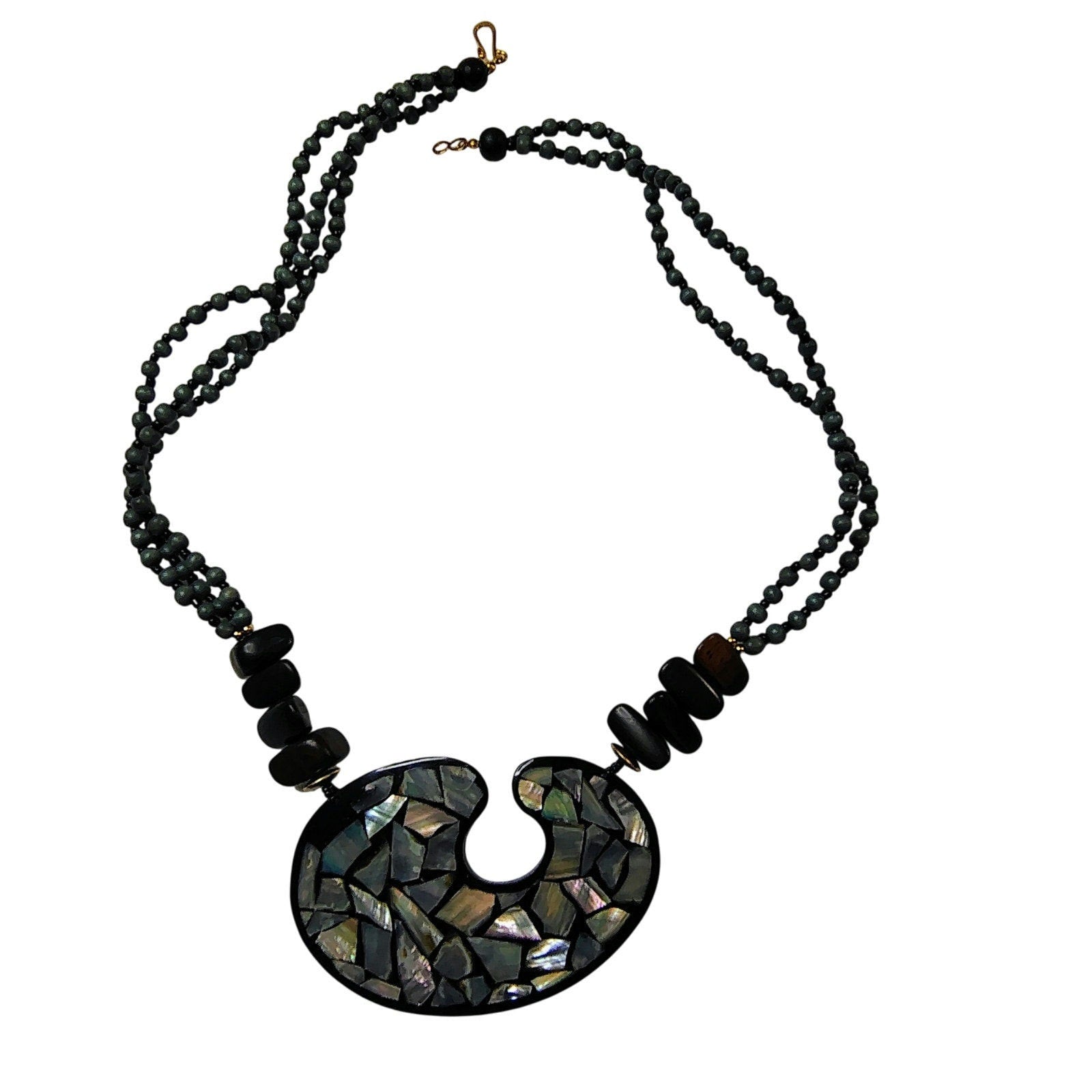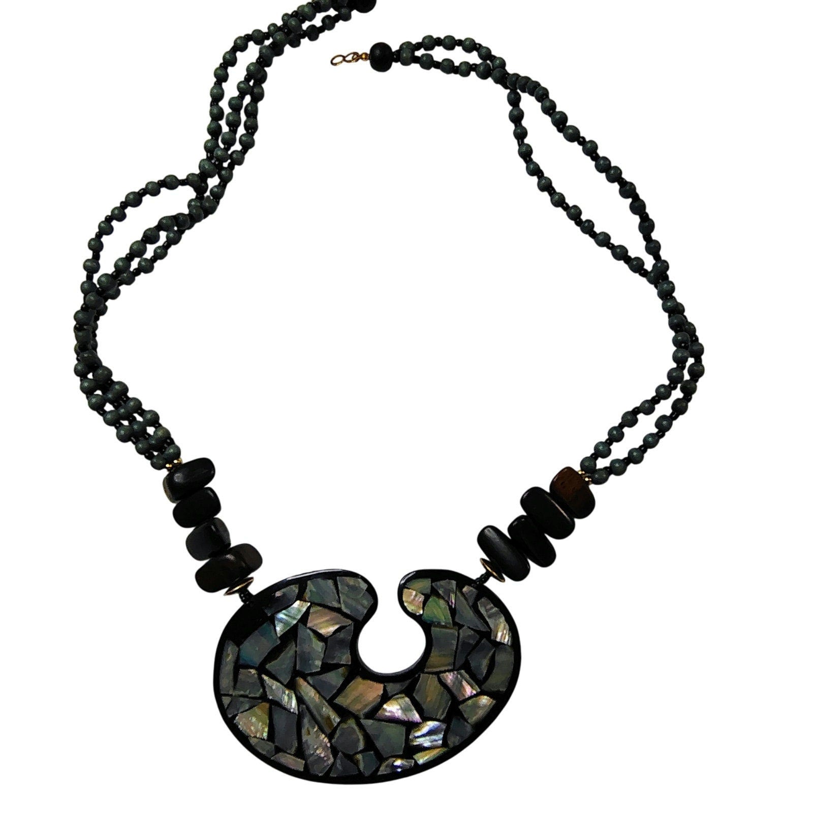 Vintage Inlay Blue Gray Shell with Mother Of Pearl Shells on Beaded Precious Stone Strand. Statement Lacquered necklace with adjustable chain link. Huge pendant sits at center of two strands of beads on one side with three stands of beads on the other side.