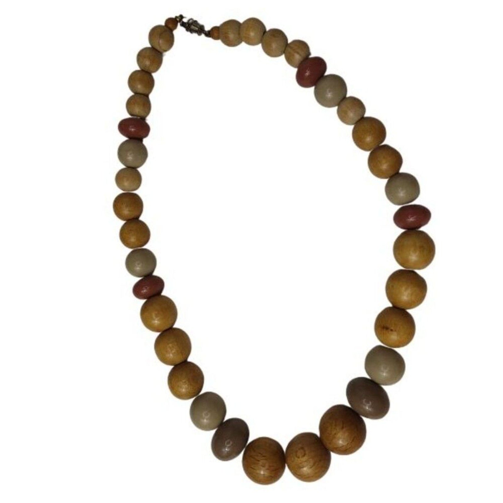 Vintage brown and green graduated necklace made with round wood beads plus plastic oval beads. Barrel clasp closure. Light shine to the beads.