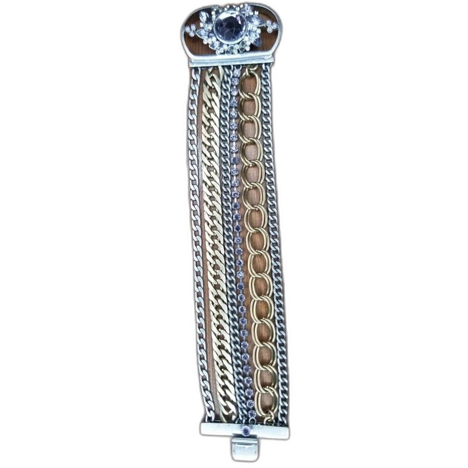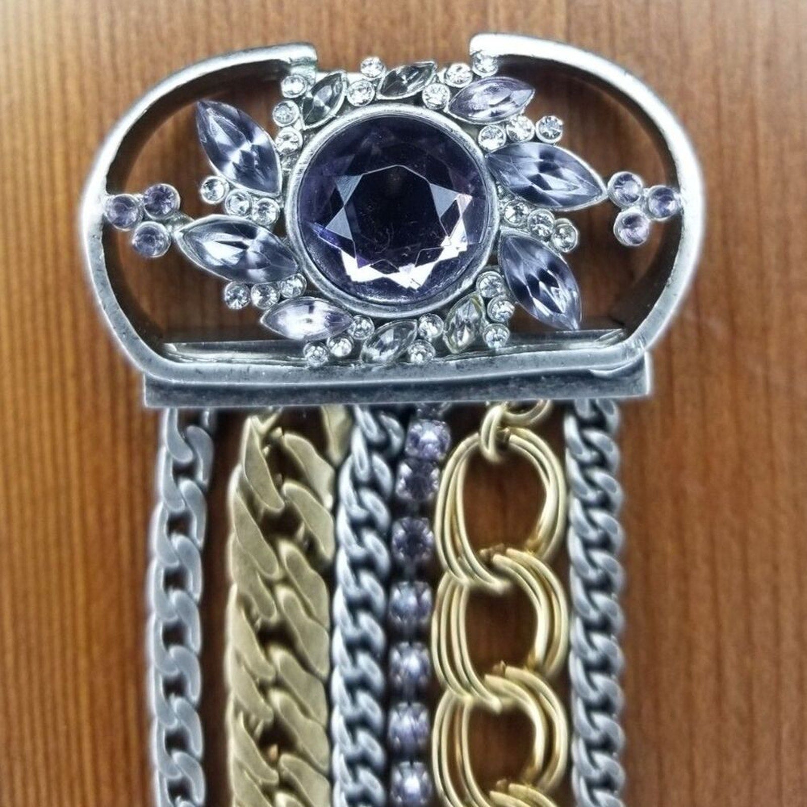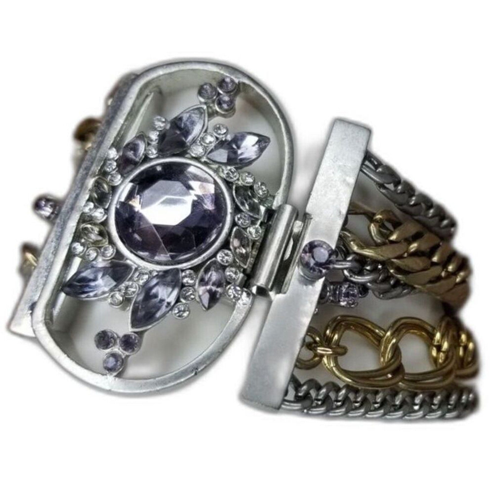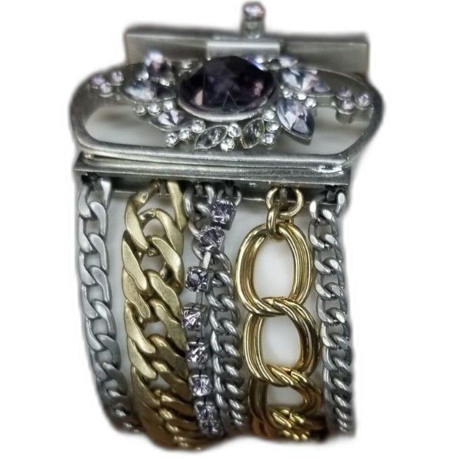 Vintage multi layered chain link crystal, gold and silver tone chain links cuff bracelet. Crystal adorned flower clips into the chain links with a push and release clasp.