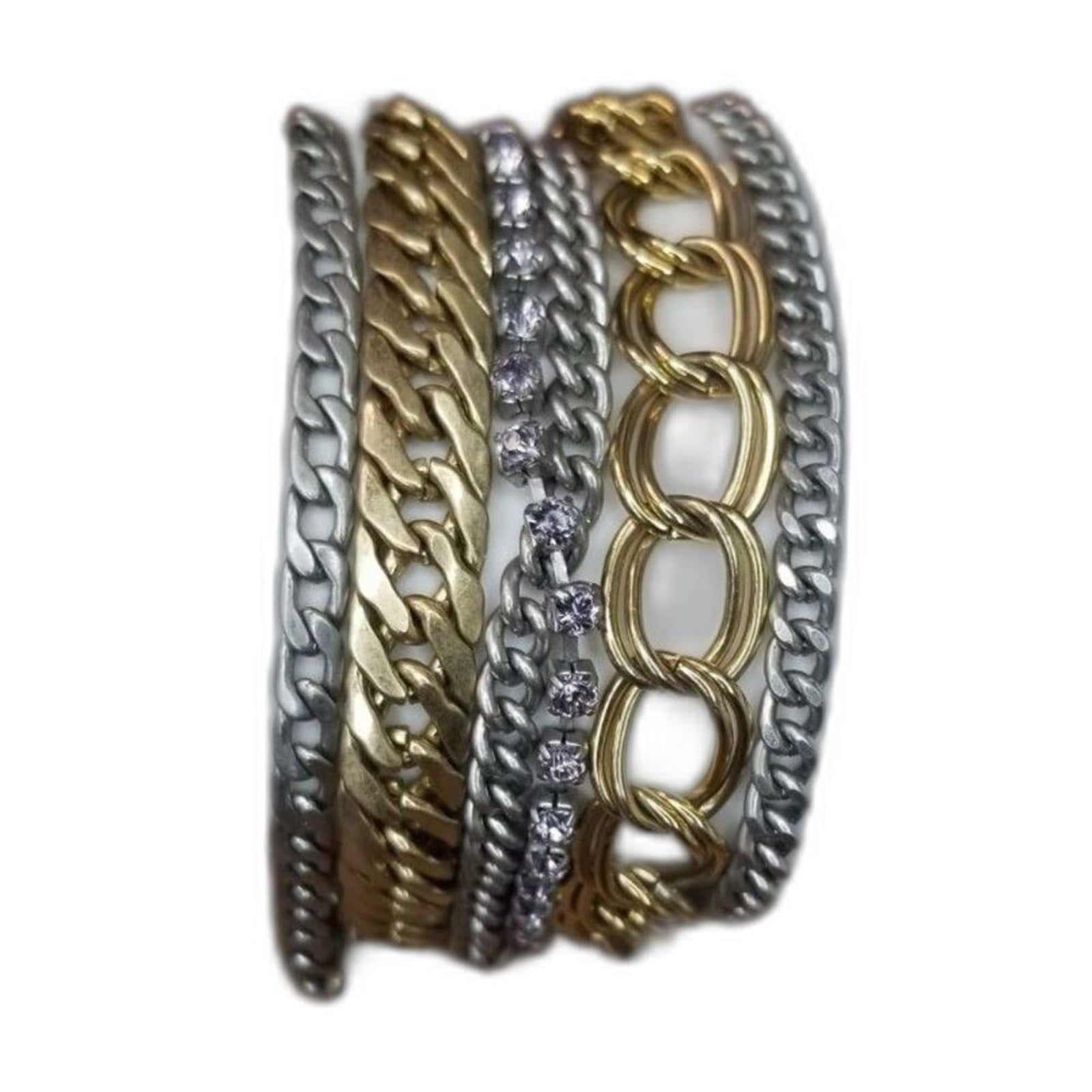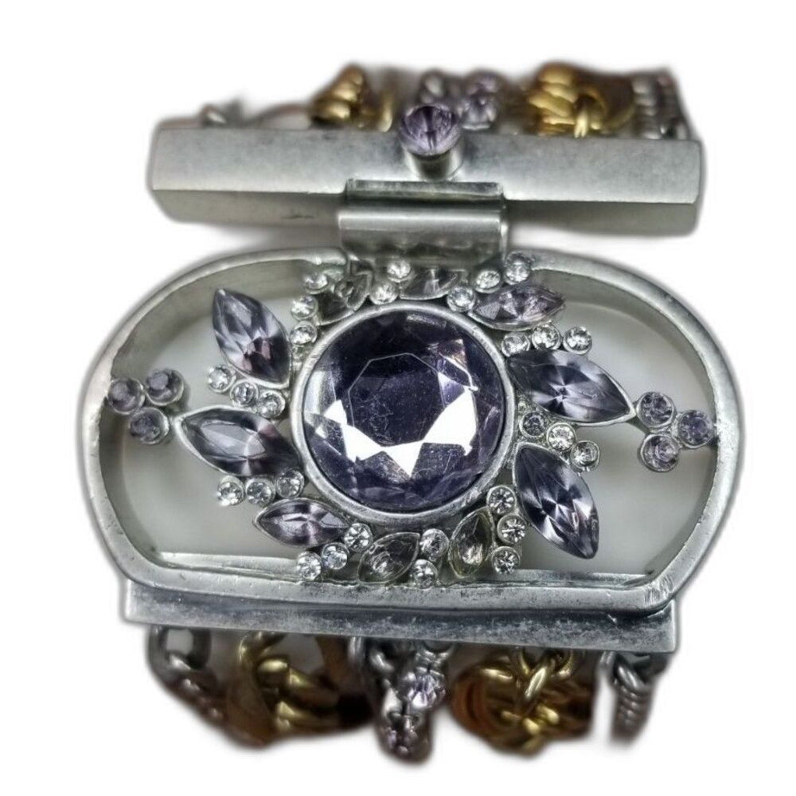 Vintage Layered Chain Link Gold Silver Tone Cuff Bracelet Crystal Adorned Flower