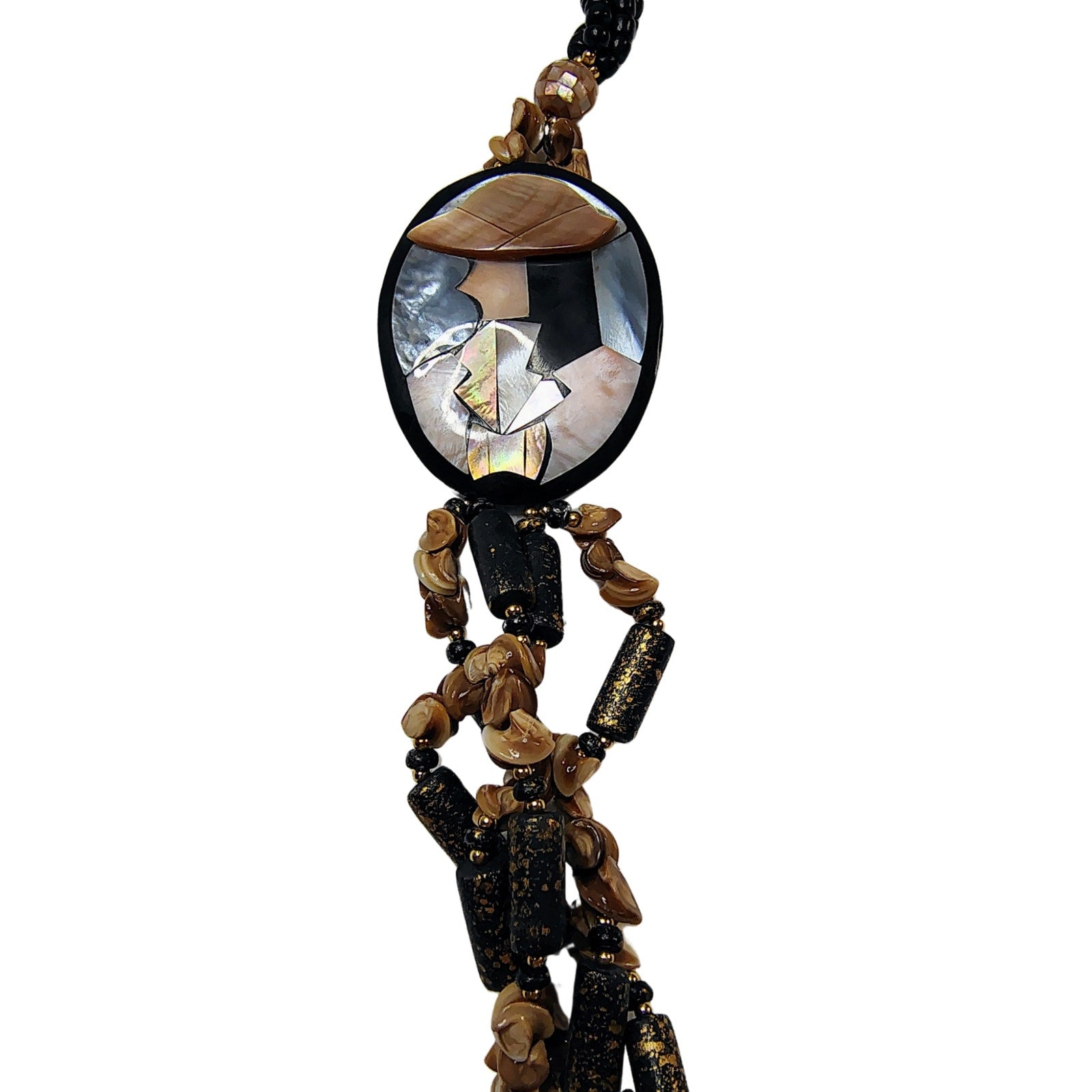 Vintage Layered Lacquered Inlay Shell Cameo Black Pink Beaded Statement Necklace