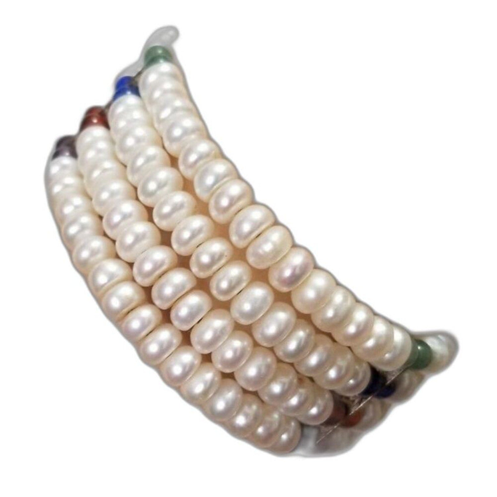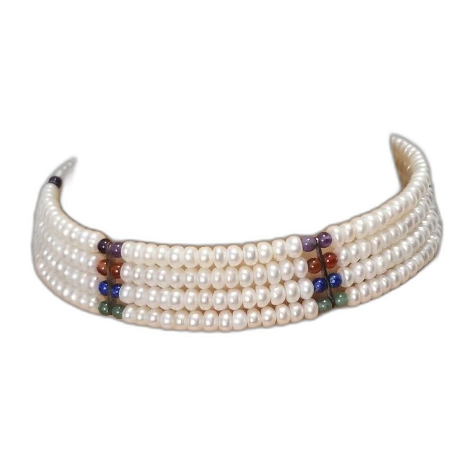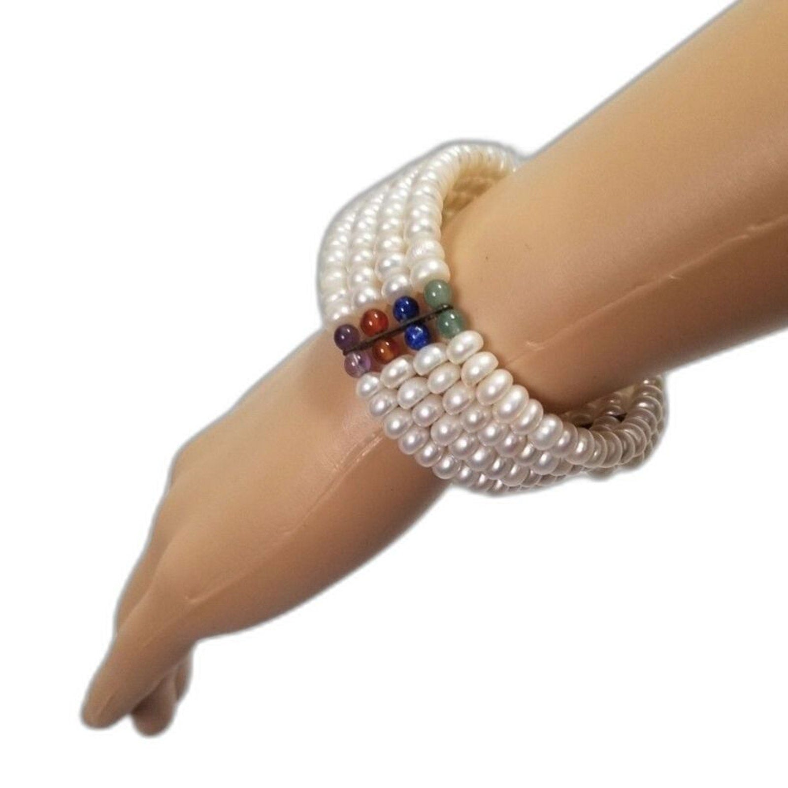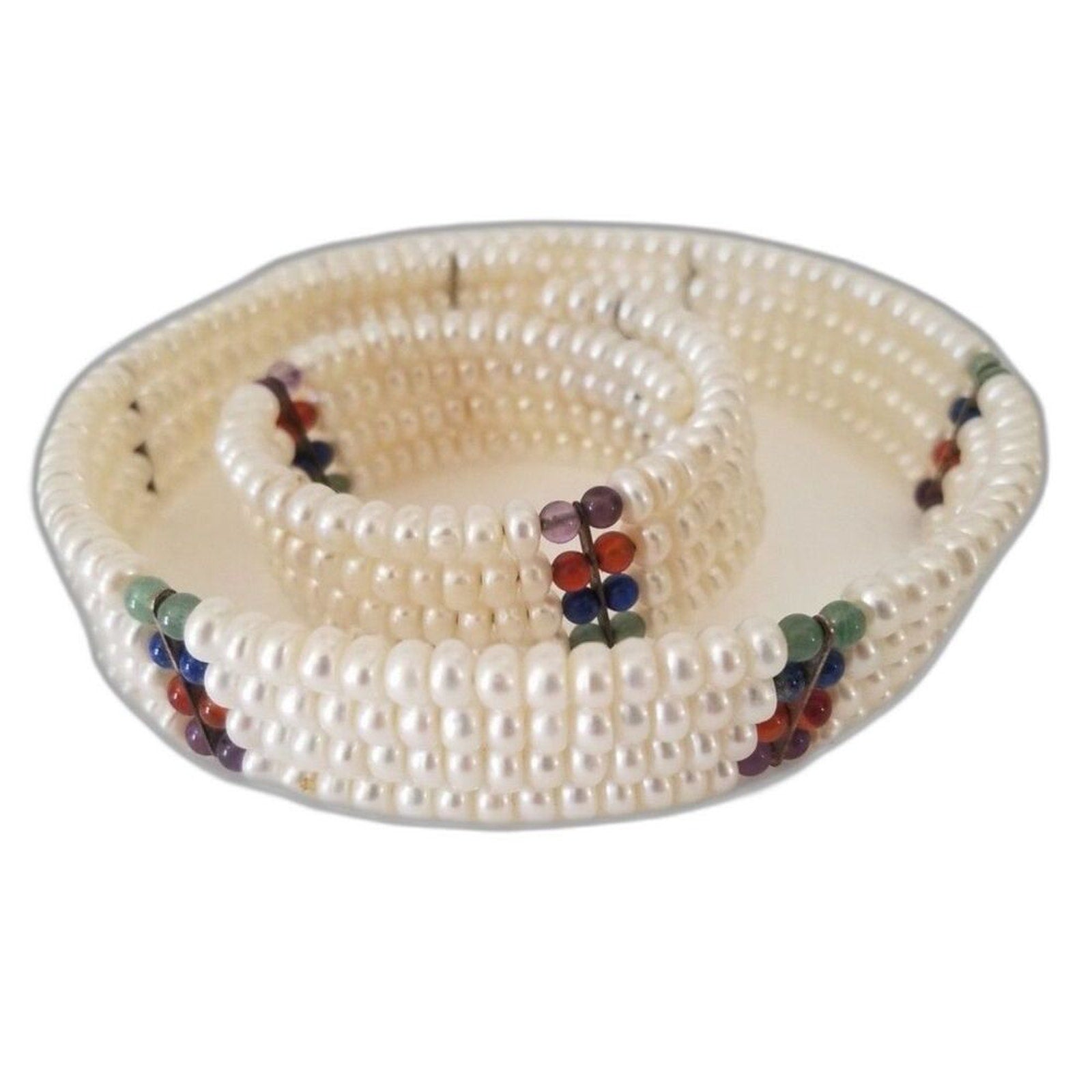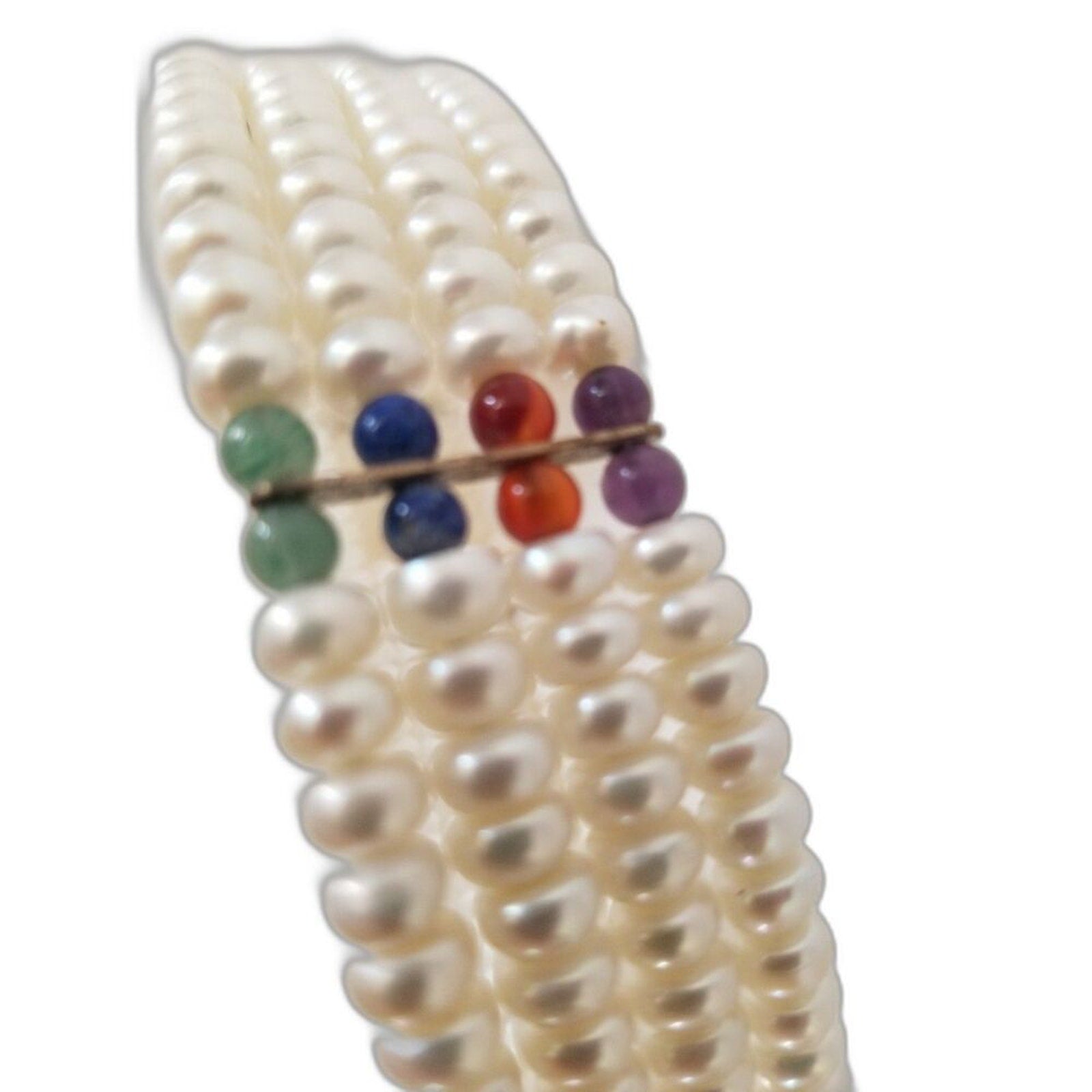 Vintage freshwater pearl & gemstone bridal set necklace and bracelet. Memory wire four (4) row flexible cream pearl choker with matching pearl bangle bracelet. Each has scattered rainbow gemstone beads throughout. Six of each color gemstones run down the front in three in separate rows on the necklace and two separate rows on the bracelet.