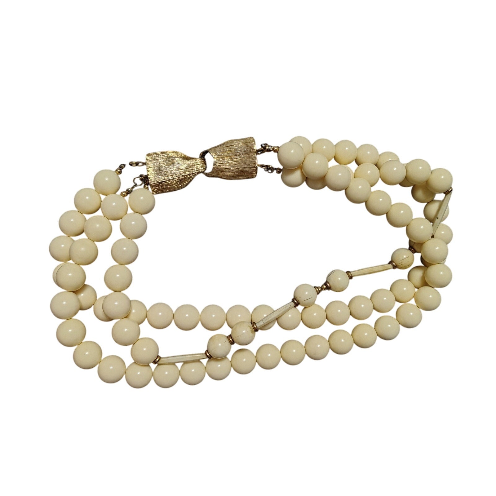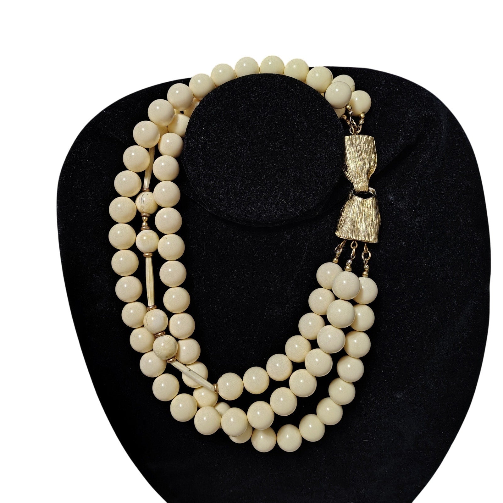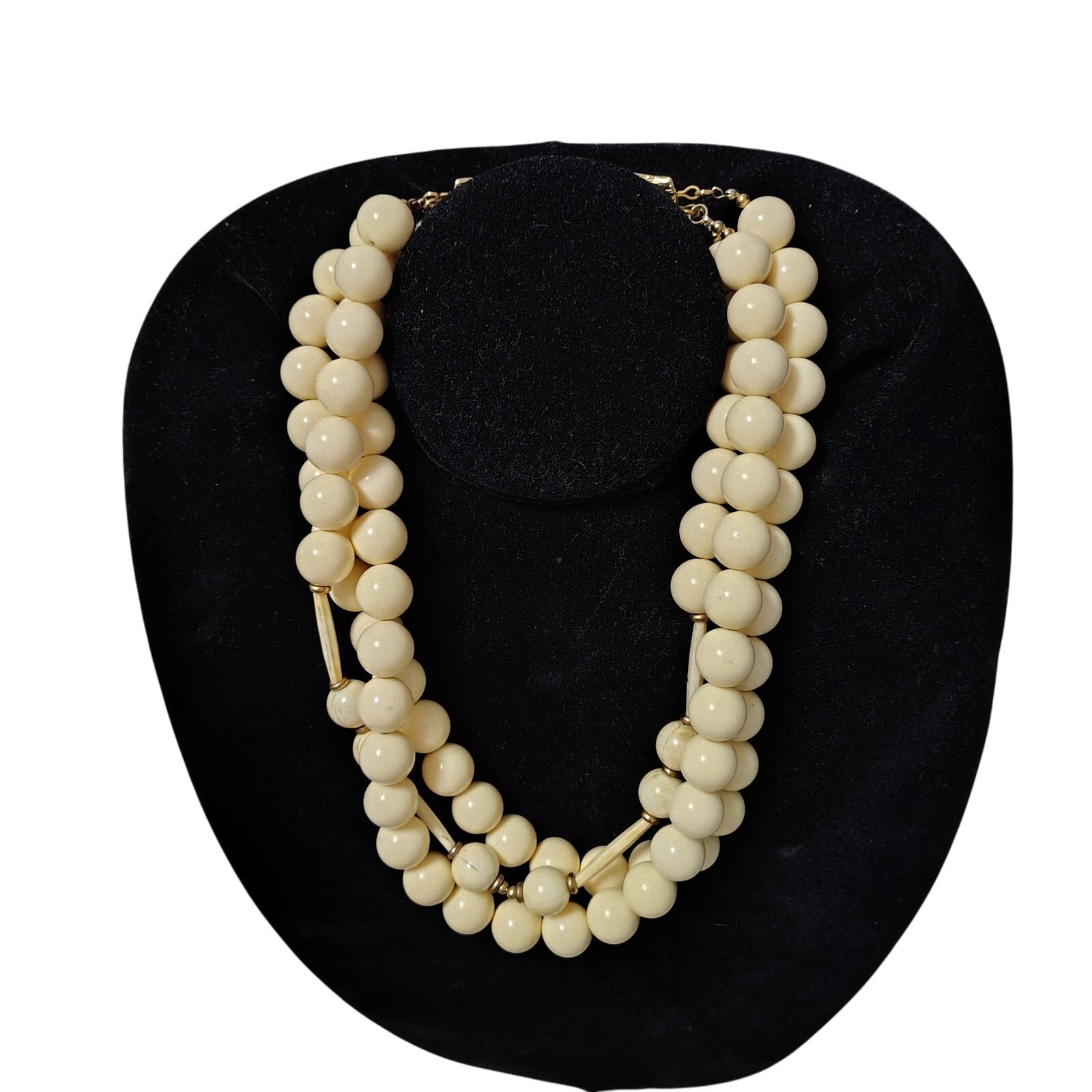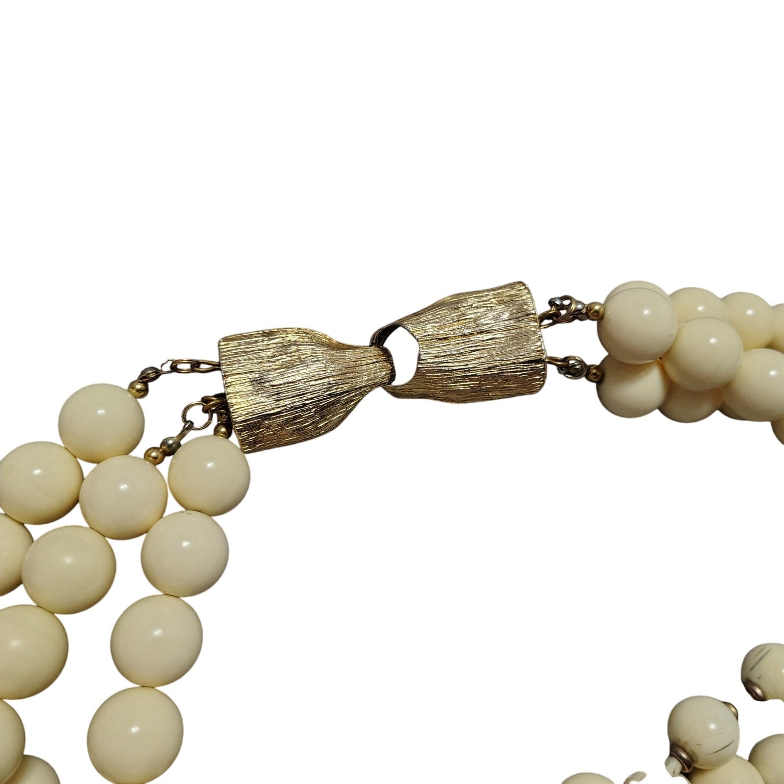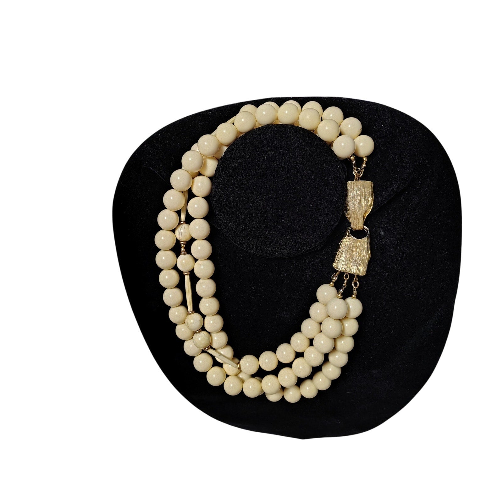 Vintage Statement 3 Strand Necklace Huge Lucite Cream Bead Large Gold Hook Clasp