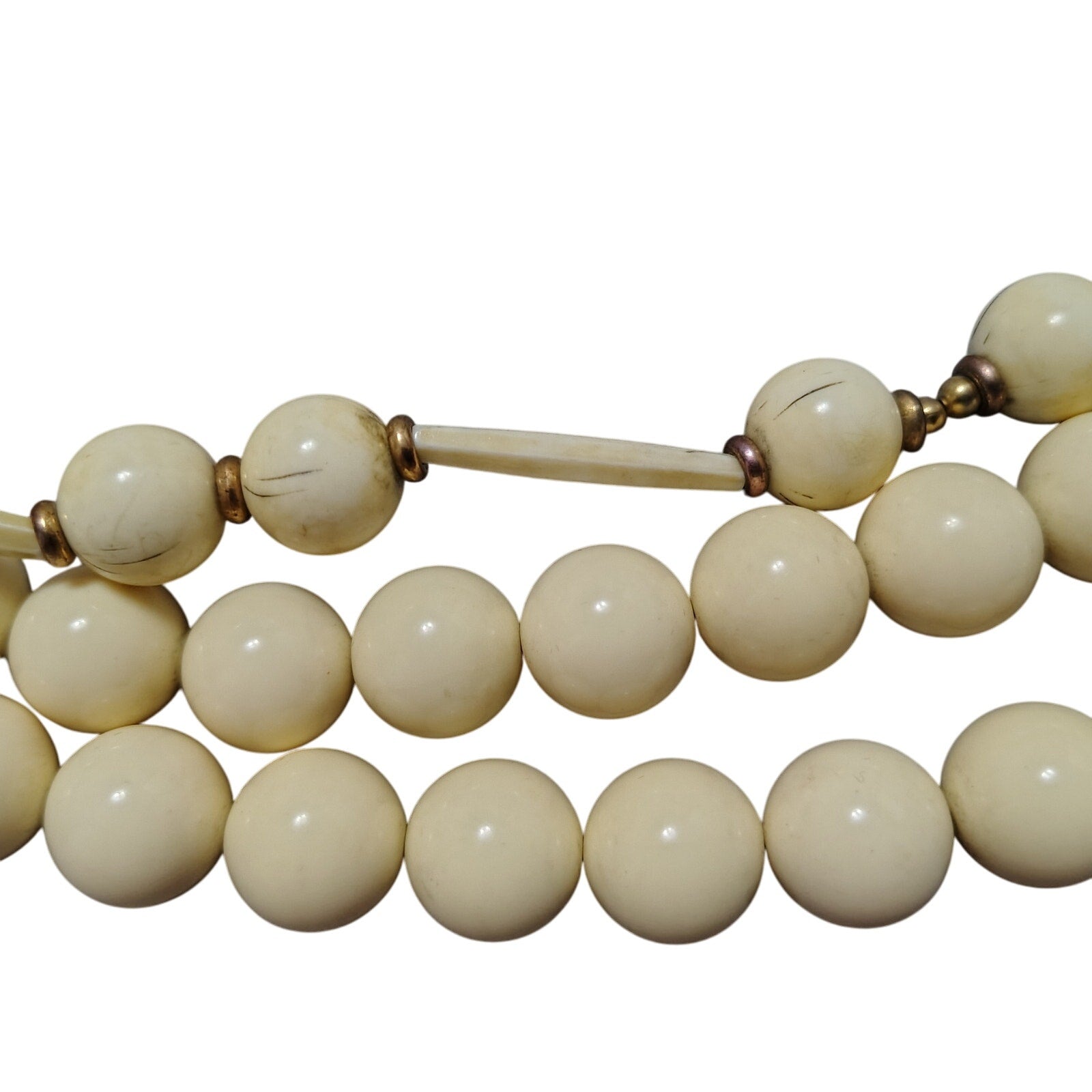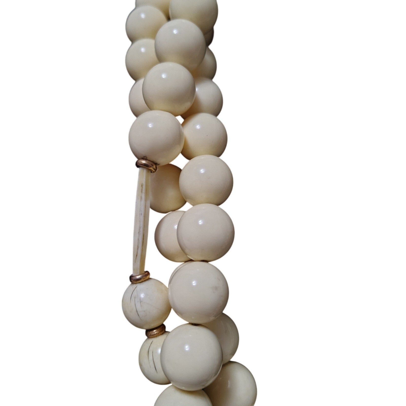 Vintage Statement 3 Strand Necklace Huge Lucite Cream Bead Large Gold Hook Clasp. Tribal style long six sided bead with gold tone hardware. Beads on the center strand have light striped markings which are part of the design.
