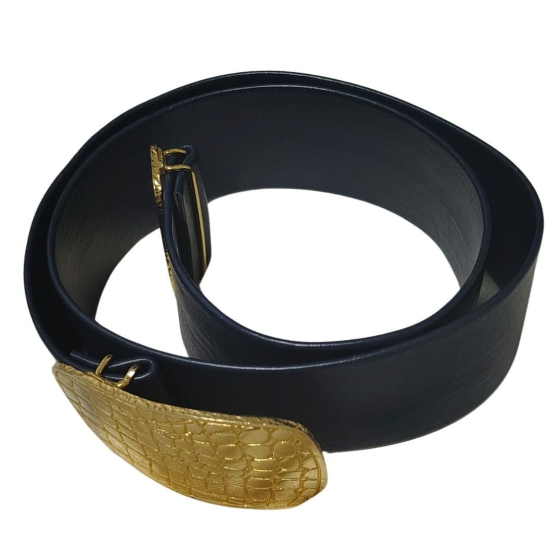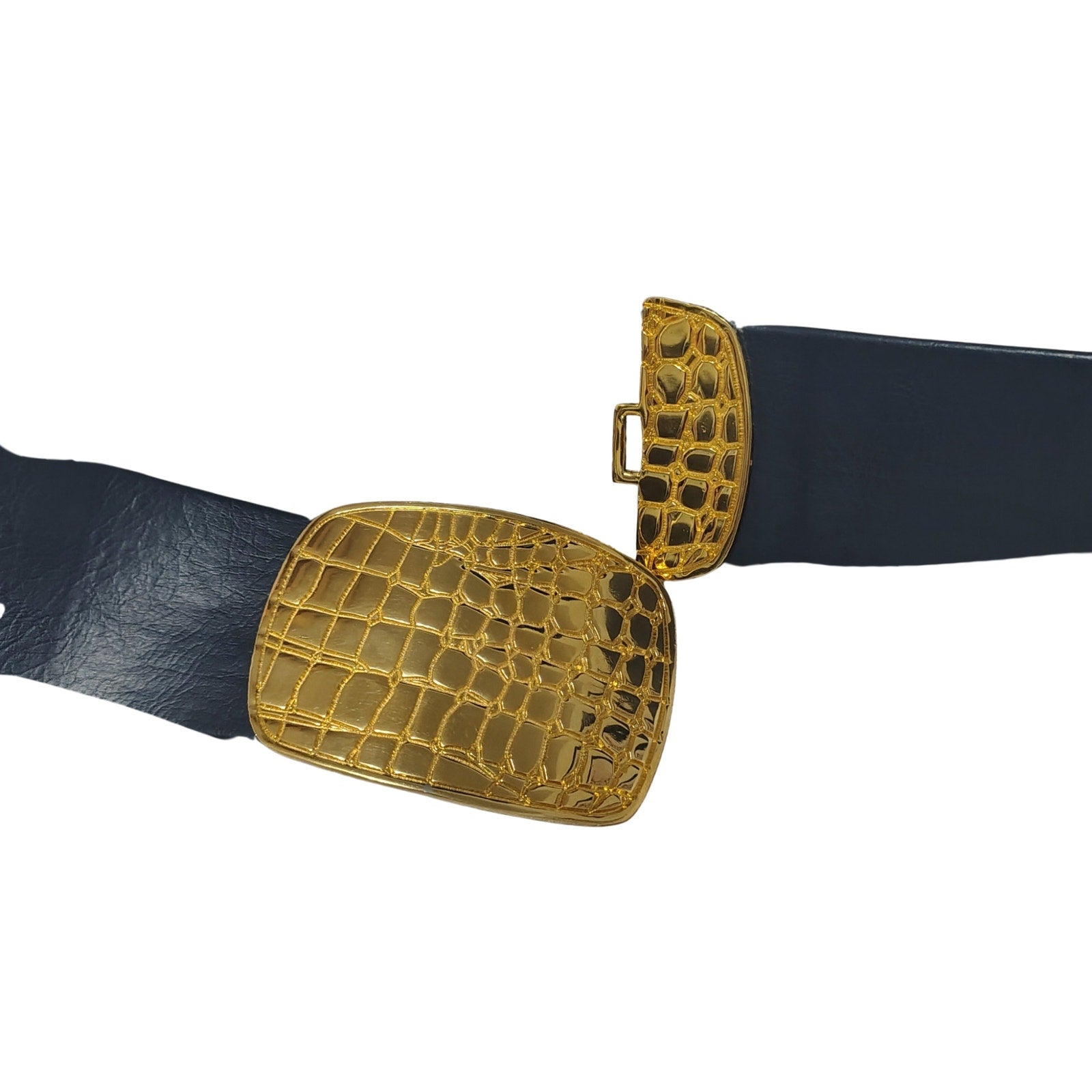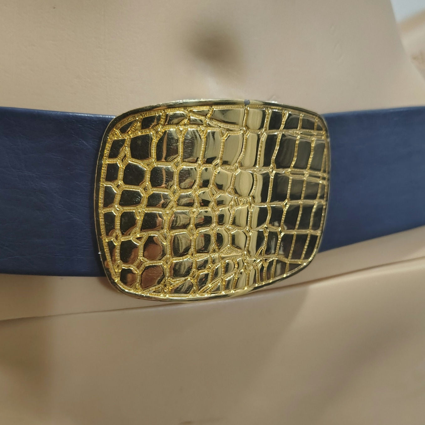Wide Blue Leather Belt Gold Crocodile Print Huge Belt Buckle Hook Closure. Leather is folded over and meets at the center to create a smooth finish. Adjustable strap and buckles makes shortening easy.