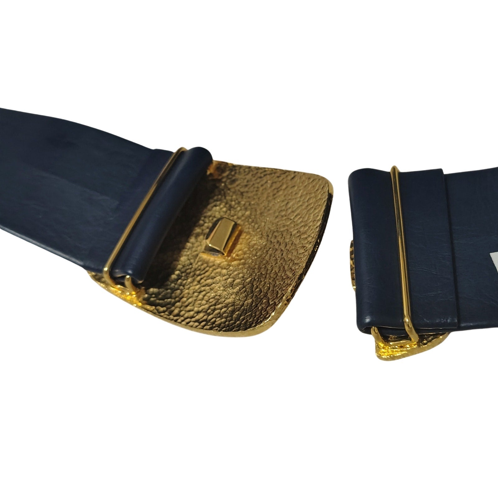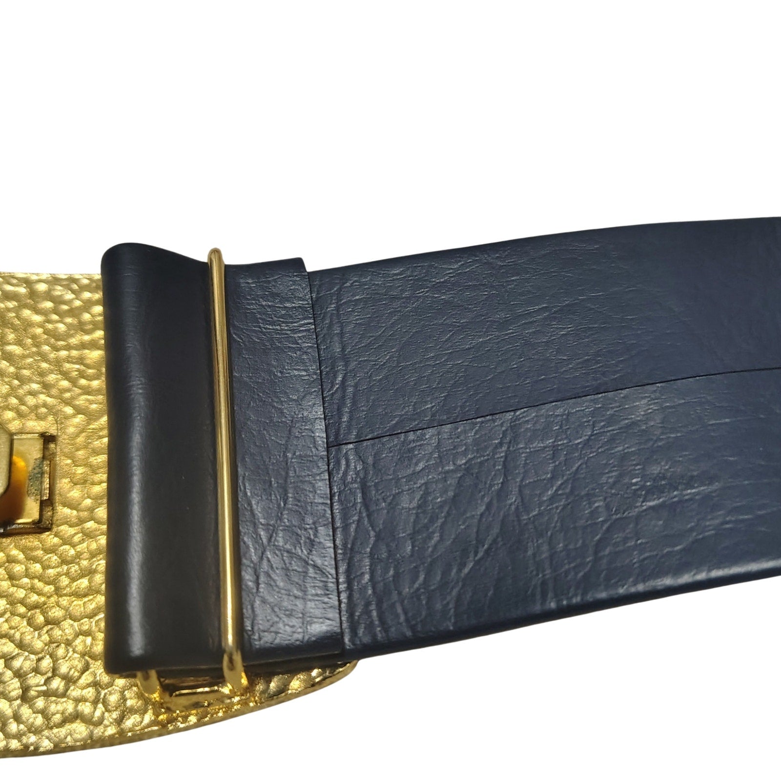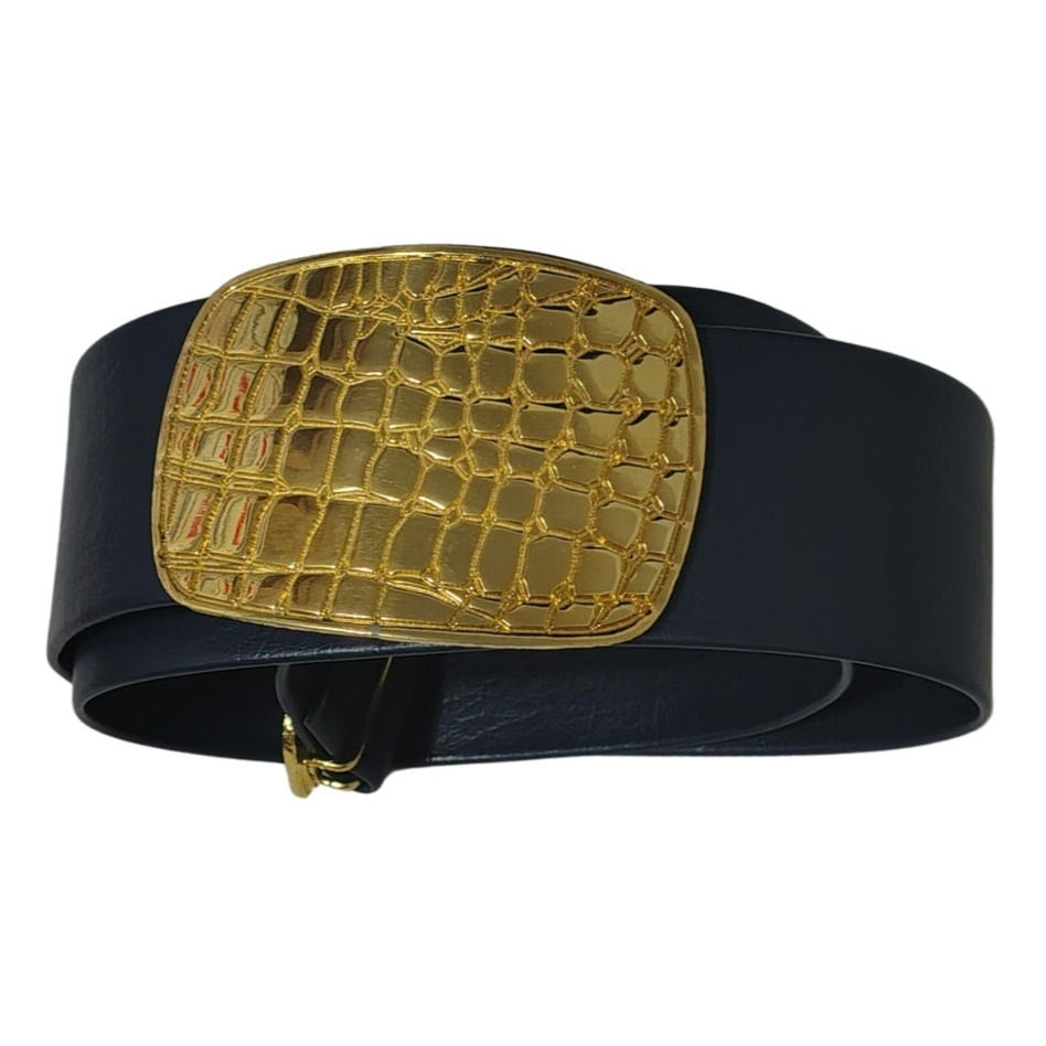 Wide Blue Leather Belt Gold Crocodile Print Huge Belt Buckle Hook Closure. Leather is folded over and meets at the center to create a smooth finish. Adjustable strap and buckles makes shortening easy.